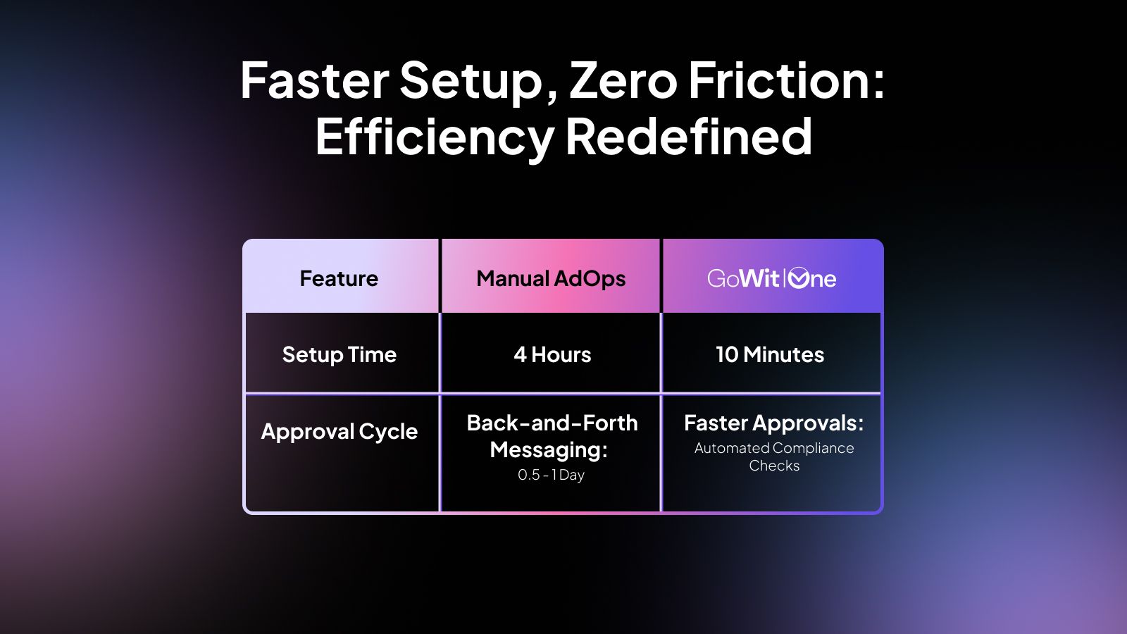 By introducing an AI-first, unified operating system, GoWit One reduces campaign setup from 4 hours to as little as 10 minutes. This isn’t just an incremental improvement; it’s a complete automation of manual AdOps, enabling agencies to go live across channels, networks, and markets in record time.